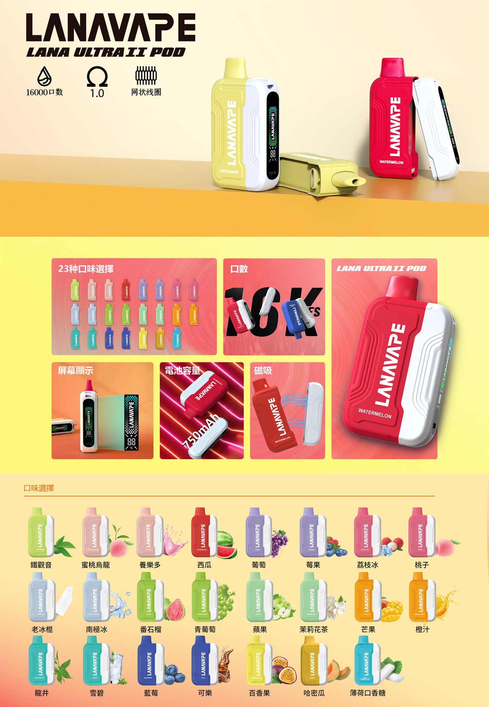 Lana 16000 系列以亮彩活潑的外觀搭配強大機能,將小巧便攜與專業性能完美結合。10ml 大容量煙彈、750mAh 可充電電池與智慧數位顯示,讓每天的使用更自在、更省心。23 種風味自由挑選,是追求口感與便利性的最佳日常電子煙。
