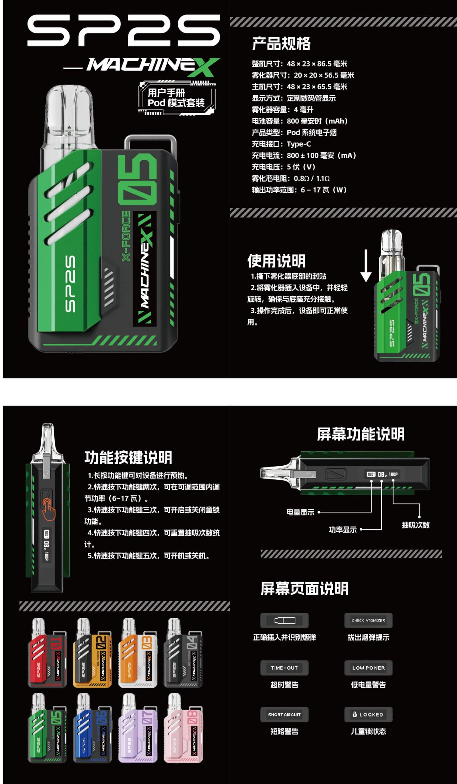 SP2S MAEHINE X 主機  硬派機甲風 盡顯酷炫本色,硬朗線條與精緻工藝完美結號盡顯酷炫魅力,6w-17w可自由調節功率以及800mAh超長續航並支援 Type-C 快速充電,OLED熒幕顯示:電量百分比+功率瓦數+抽吸口數。雙陶瓷線圈煙彈、符合人體工學的 AFC,帶給您更便利的使用體驗。