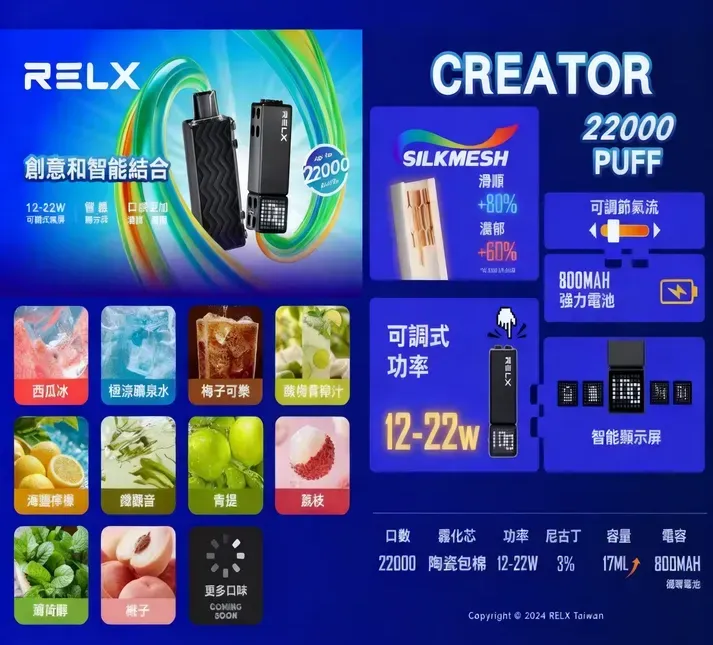 RELX Creator 22000 積木一次性電子煙,主打超長續航與高性能霧化體驗。內建 17mL 大容量煙油 + 800mAh 電池,搭配 SilkMesh™ 超細霧化科技,帶來更綿密、飽滿且均勻的口感呈現。支援 12–22W 可調功率、可視化 智能顯示螢幕 與 可調式氣流系統,無論 MTL 或 RDL 均能精準調校。